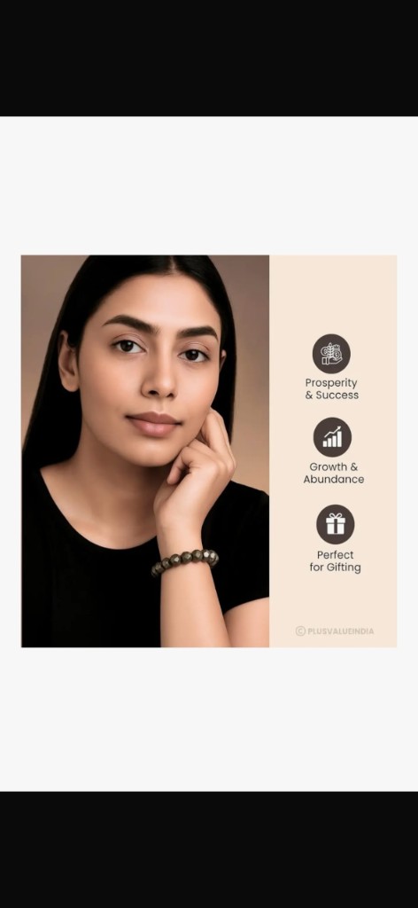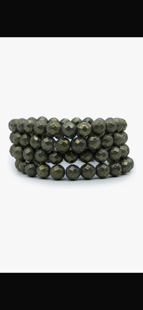 Stretch bracelet of faceted natural pyrite beads with a dark metallic lustre — worn for prosperity, confidence, and steady positive energy in daily life. Unisex styling works for office, travel, or gifting.